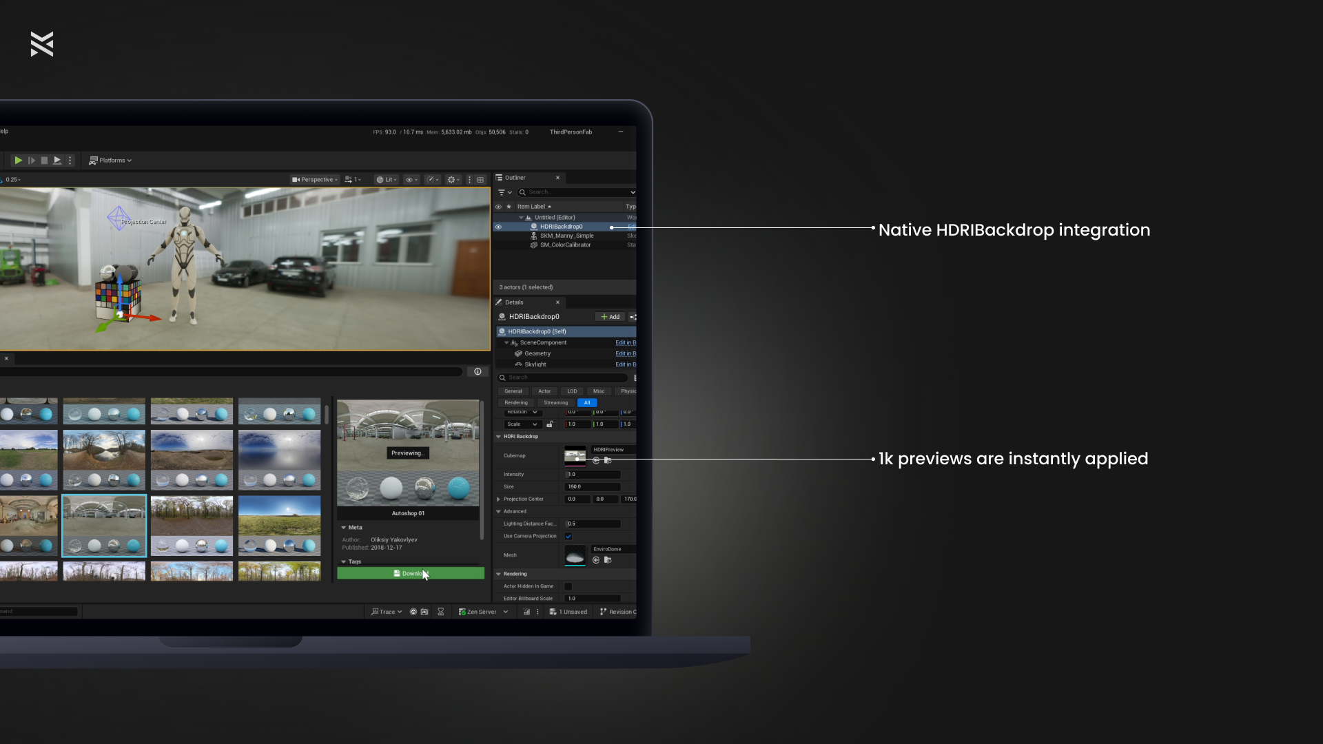 - Requires Epic’s HDRIBackdrop to apply cubemaps in scene.